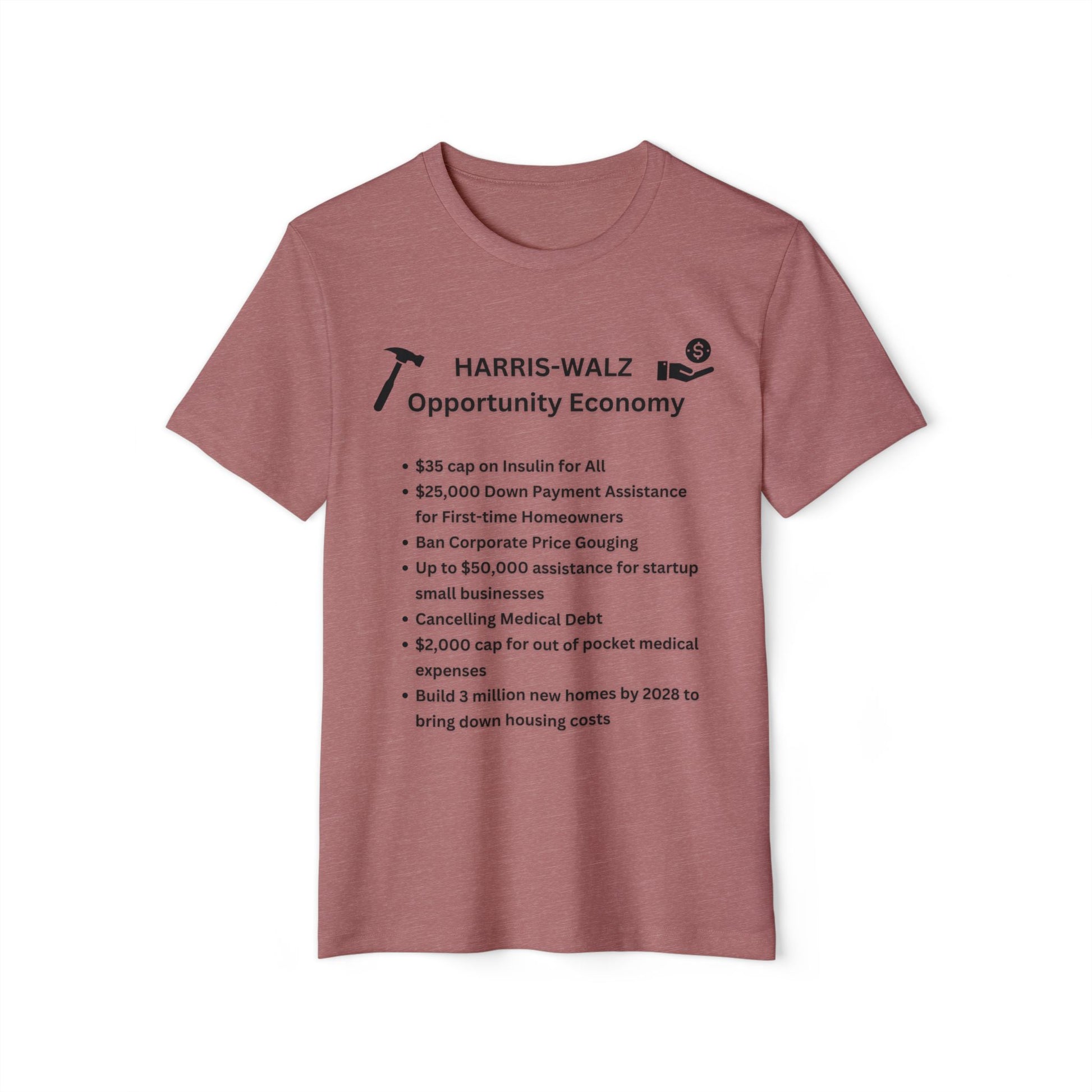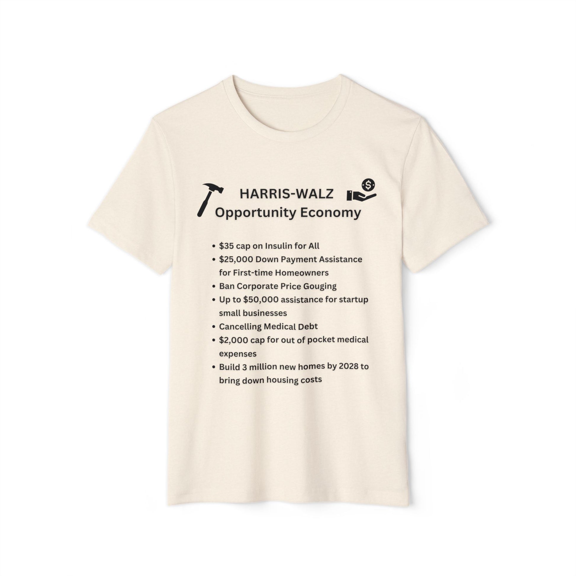 Are you ready to elect Kamala Harris and Tim Walz for President and Vice President? Me too! That is why I created this custom designed Opportunity Economy Shirt. We don't just have "concepts of a plan" Kamala Harris and Tim Walz have a DETAILED PLAN. We wive out our values of creating a sustainable world and that is why I am excited to introduce this shirt, which is made from 45% recycled polyester and 55% organic cotton, creating a very smooth fabric, perfect for printing vibrant designs! Not only is it made from recycled material, but it is comfortable to wear too! This t-shirt has a modern semi-relaxed fit with a trendy high neckline. There is NO other design like this in this election so make sure to STAND OUT and SHOW what an Opportunity Economy can do for America!