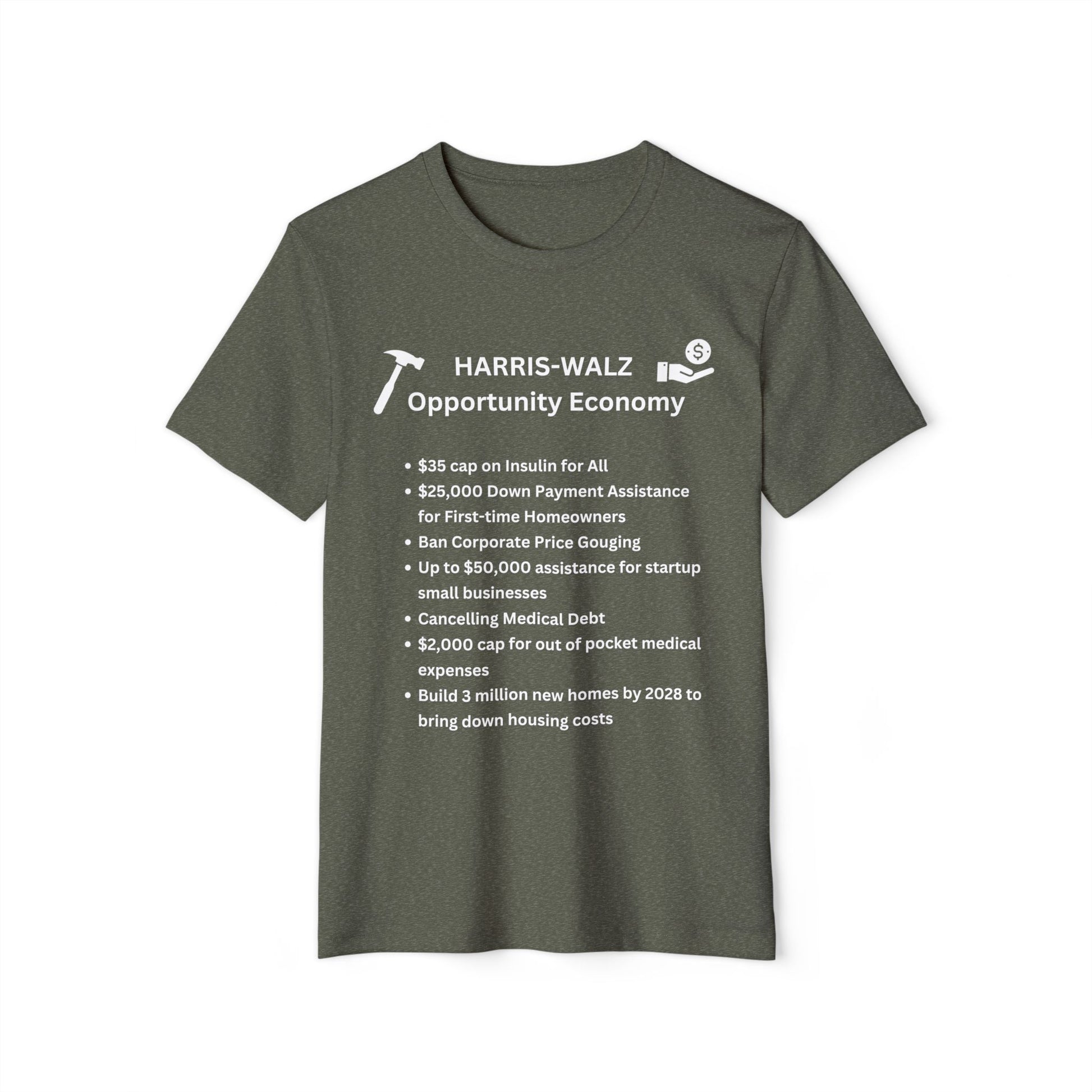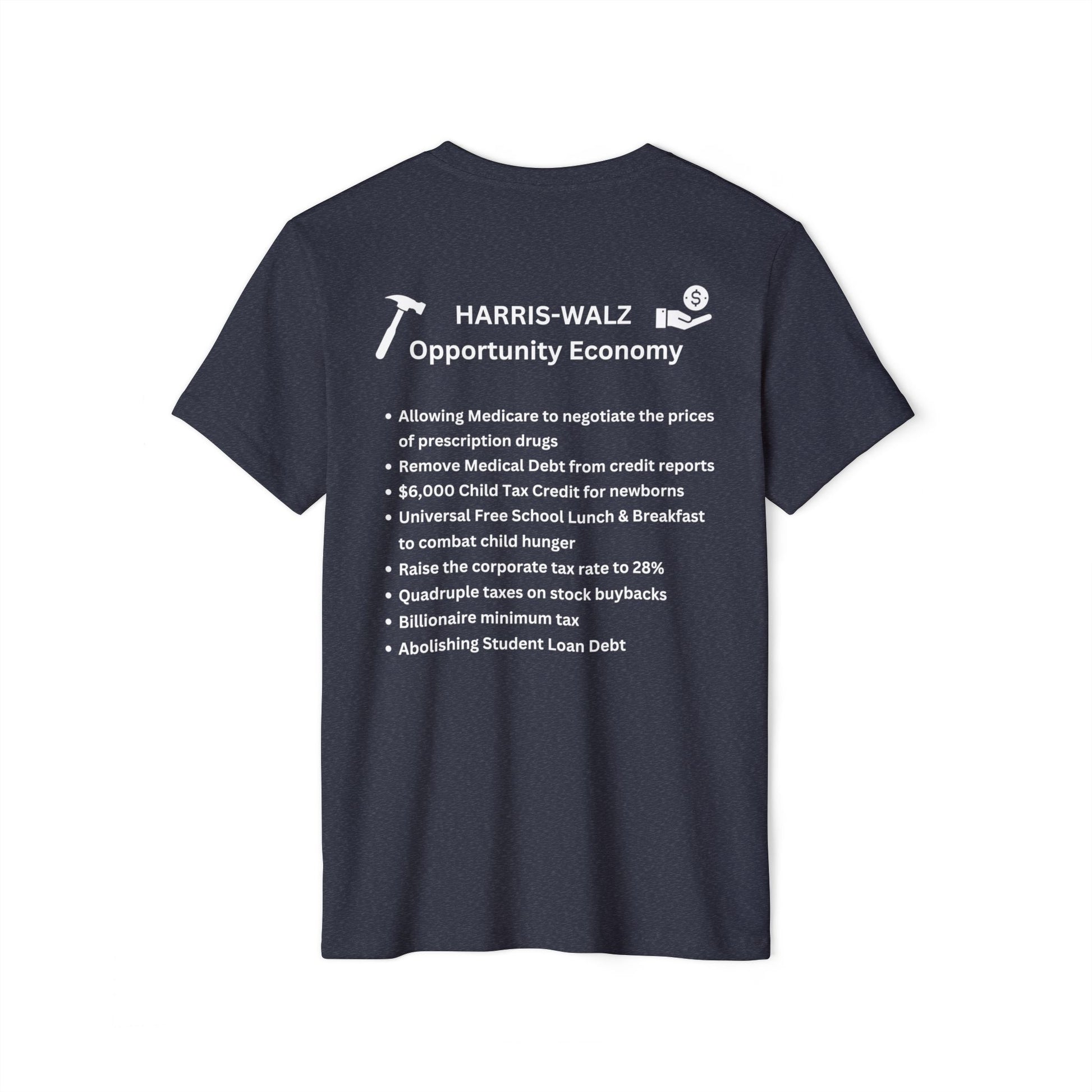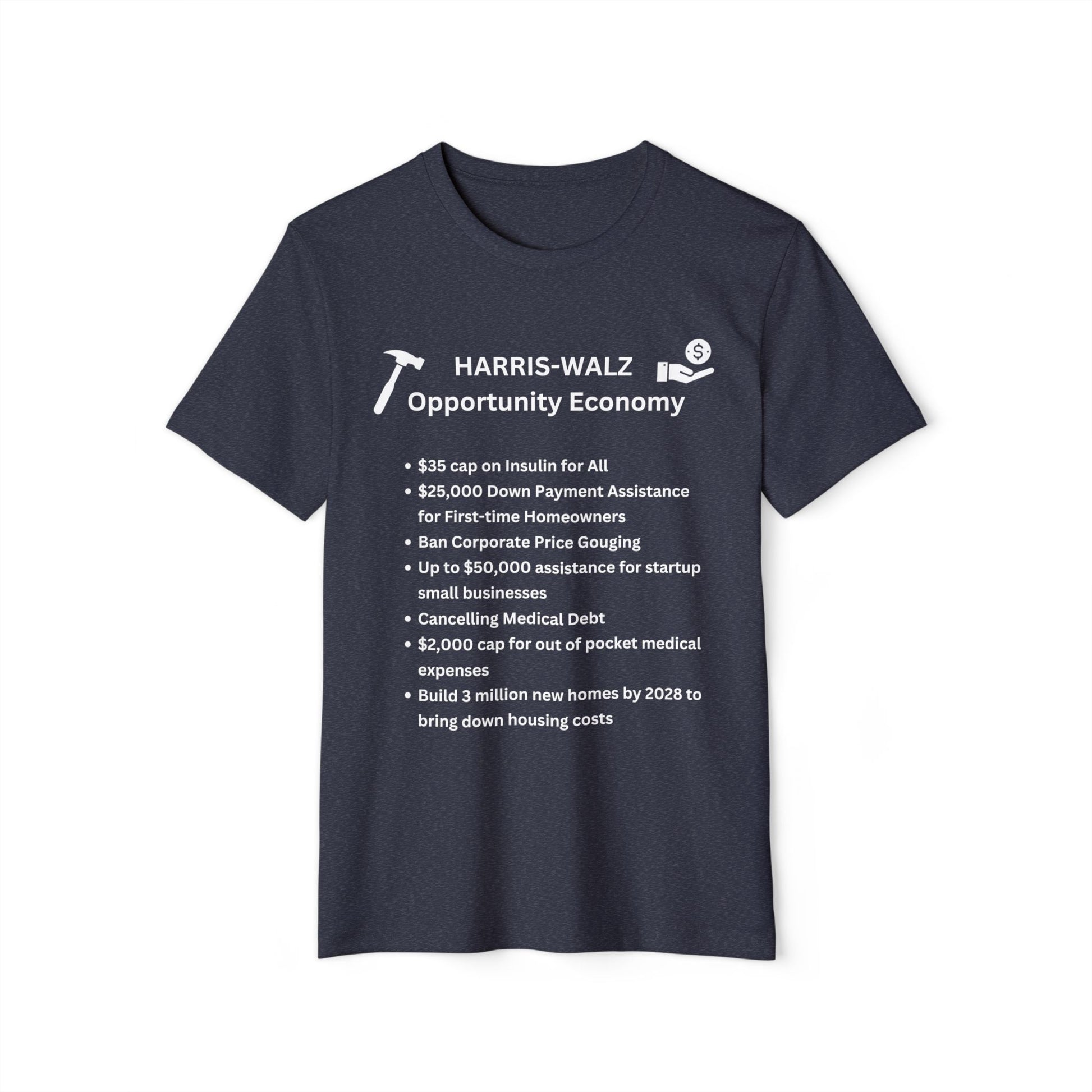 Are you ready to elect Kamala Harris and Tim Walz for President and Vice President? Me too! That is why I created this custom designed Opportunity Economy Shirt. We don't just have "concepts of a plan" Kamala Harris and Tim Walz have a DETAILED PLAN. We wive out our values of creating a sustainable world and that is why I am excited to introduce this shirt, which is made from 45% recycled polyester and 55% organic cotton, creating a very smooth fabric, perfect for printing vibrant designs! Not only is it made from recycled material, but it is comfortable to wear too! This t-shirt has a modern semi-relaxed fit with a trendy high neckline. There is NO other design like this in this election so make sure to STAND OUT and SHOW what an Opportunity Economy can do for America!
